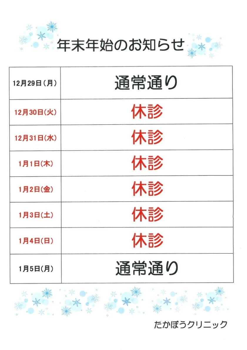 年末年始の診療について、下記の通りご案内いたします。