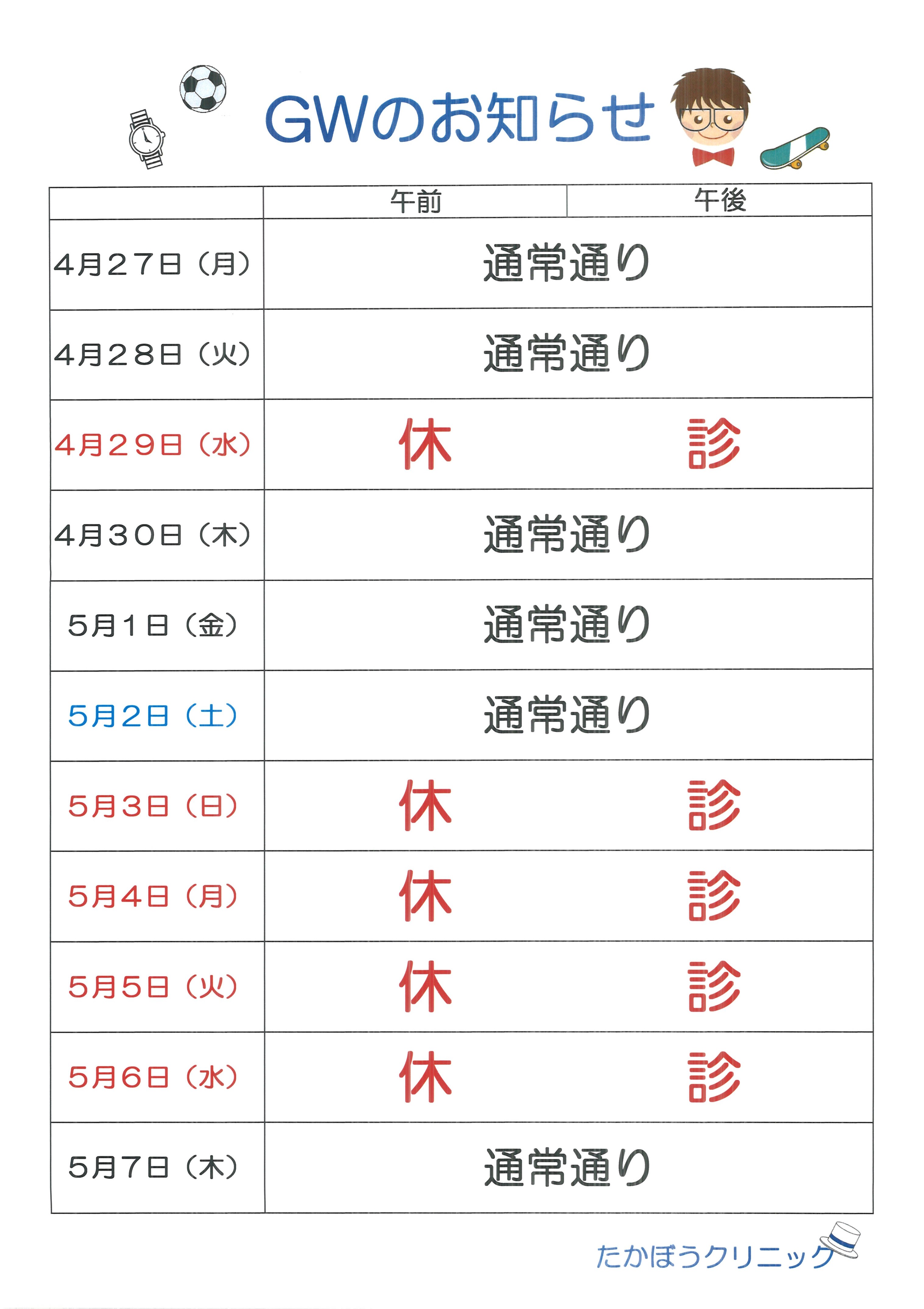 2026年04月18日 ゴールデンウィークのお知らせ お知らせ いつも当クリニックをご利用いただき、ありがとうございます。 ゴールデンウィークについて、下記の通りご案内いたします。 なお、当クリニックで透析を受けている患者さまにつきましては、 ゴールデンウィークも透析治療は休まず行います。 皆さまにはご不便をおかけしますが、ご理解のほどよろしくお願いいたします。